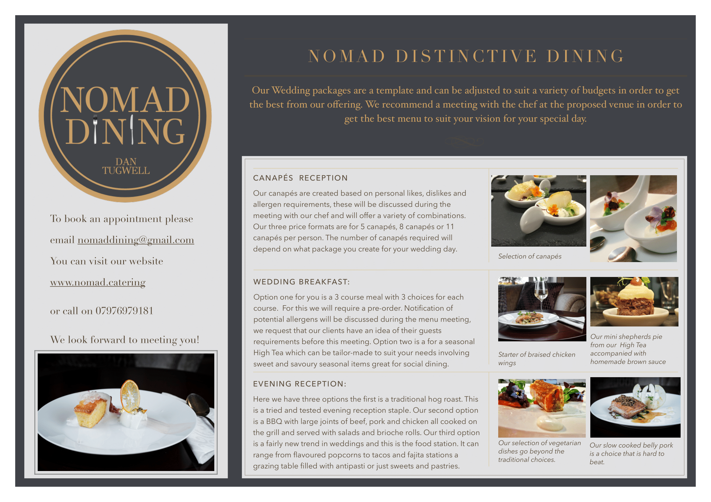 At Nomad Dining we like to give people a distinctive dining experience and for our wedding guests this is no different. We begin with your own menu, not menu A,B or C but a meeting with our chef Dan who will guide you through the menu process with your tastes in mind, giving you your best meal for your wedding day and for your budget. Once we have your menu it will be time to taste, this will be in the comfort of your own home (travel limitations may apply). With years of experience in weddings and large events, your special day is in safe hands with Nomad Dining.
